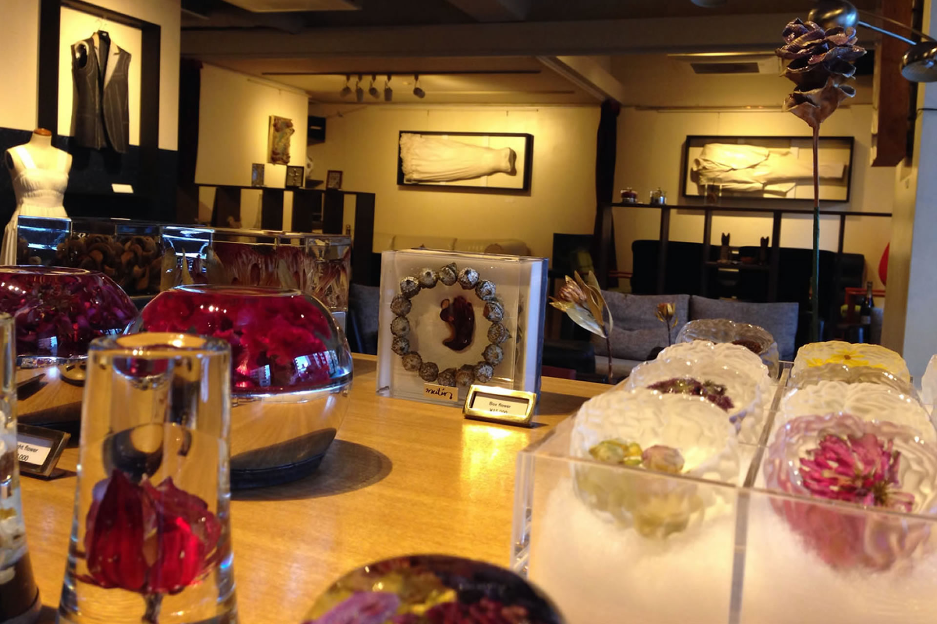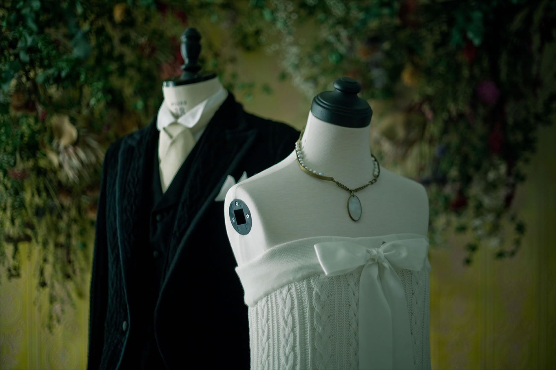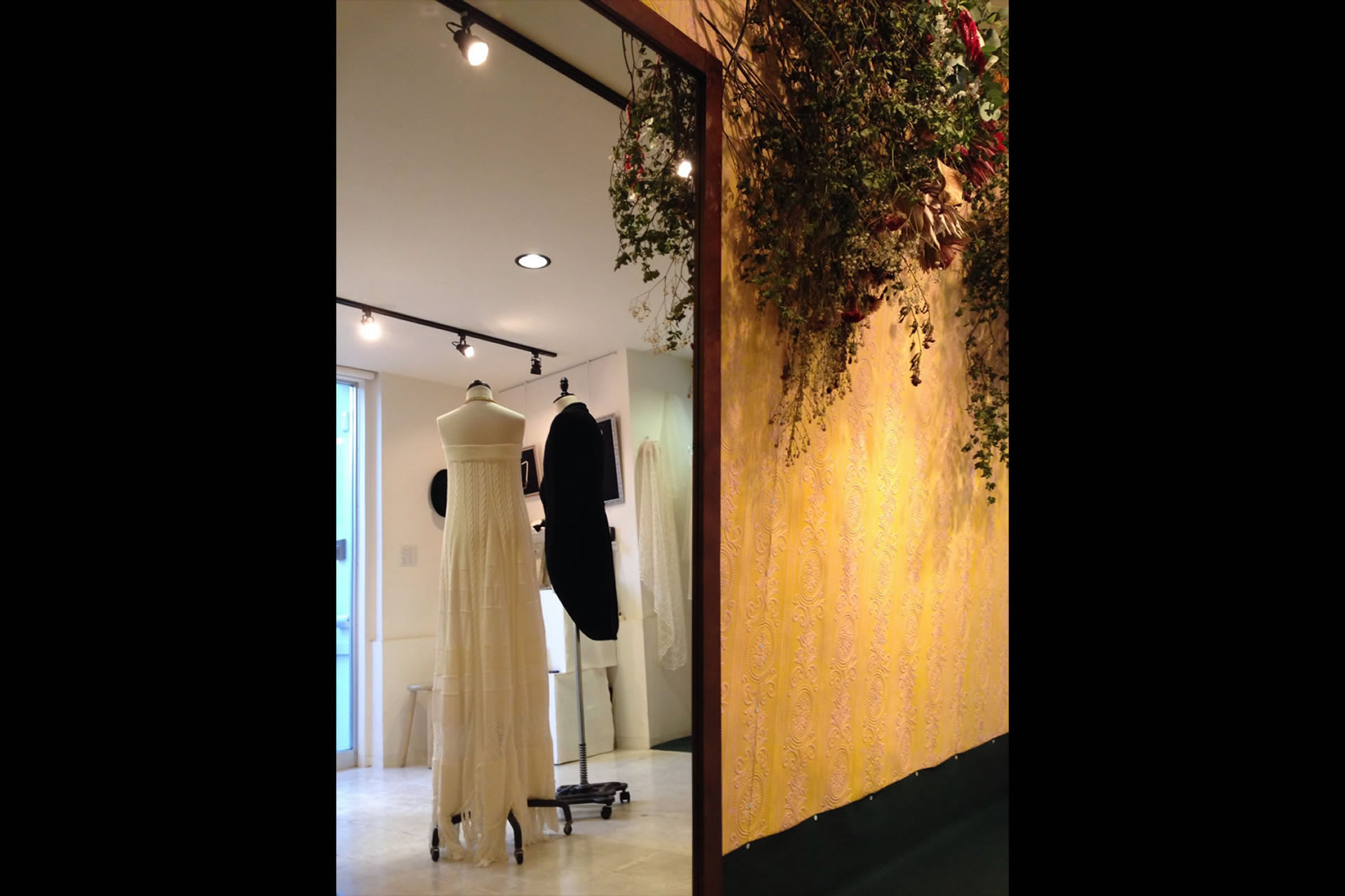 contrast case (対比の事例)と題し、二つの会場にて服作りの過程と体感を提案。中目黒のカフェ「CAMARADA」では、物作りの過程の展示、製作風景を追った映像の発表、flower artの展示を行いました。池尻大橋にあるオルタナティブスペース「NANJO HOUSE」ではドレス、モーニング等をどなたでも自由にご試着いただき、服を着る喜びや楽しさを体感していただく展示を行いました。
