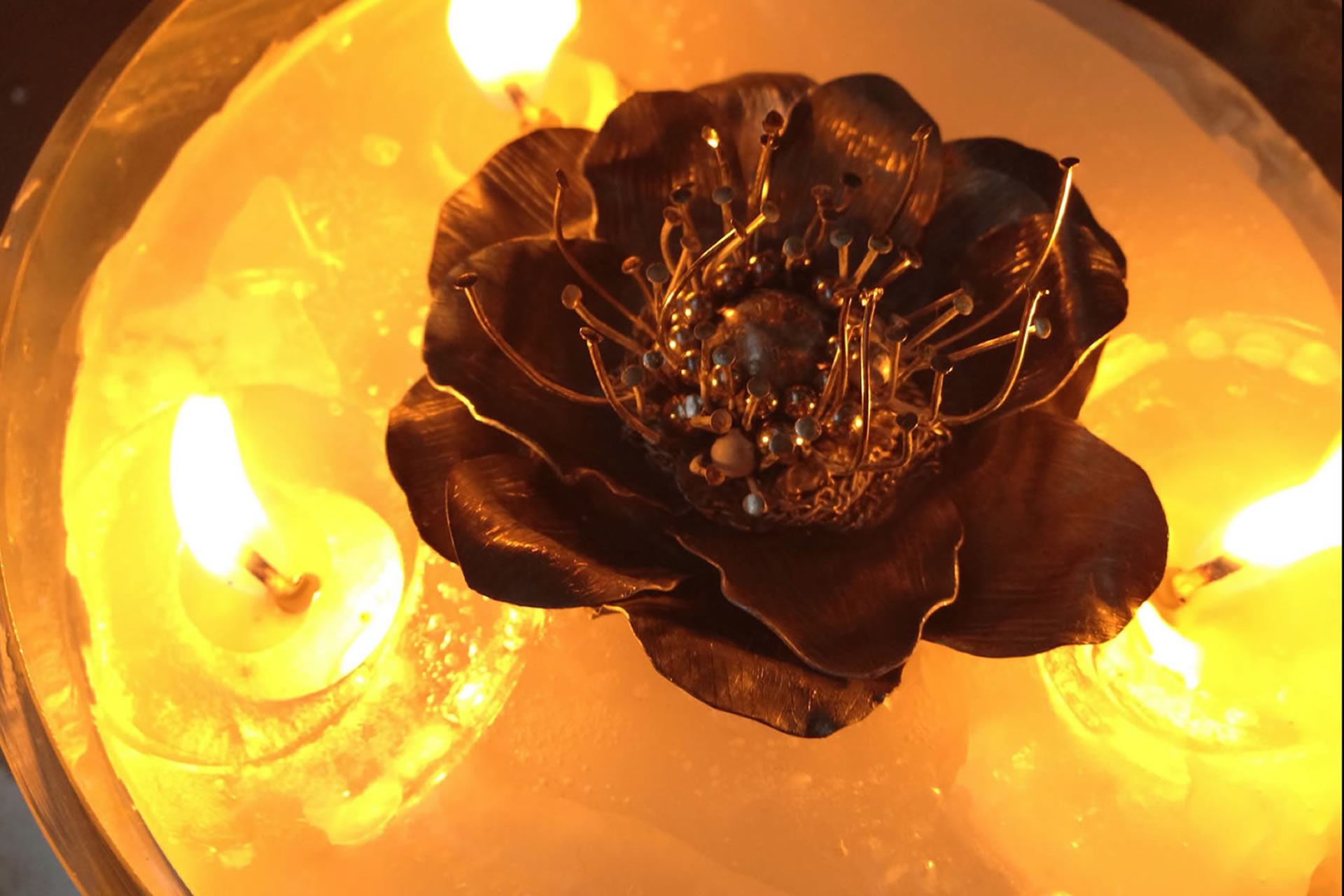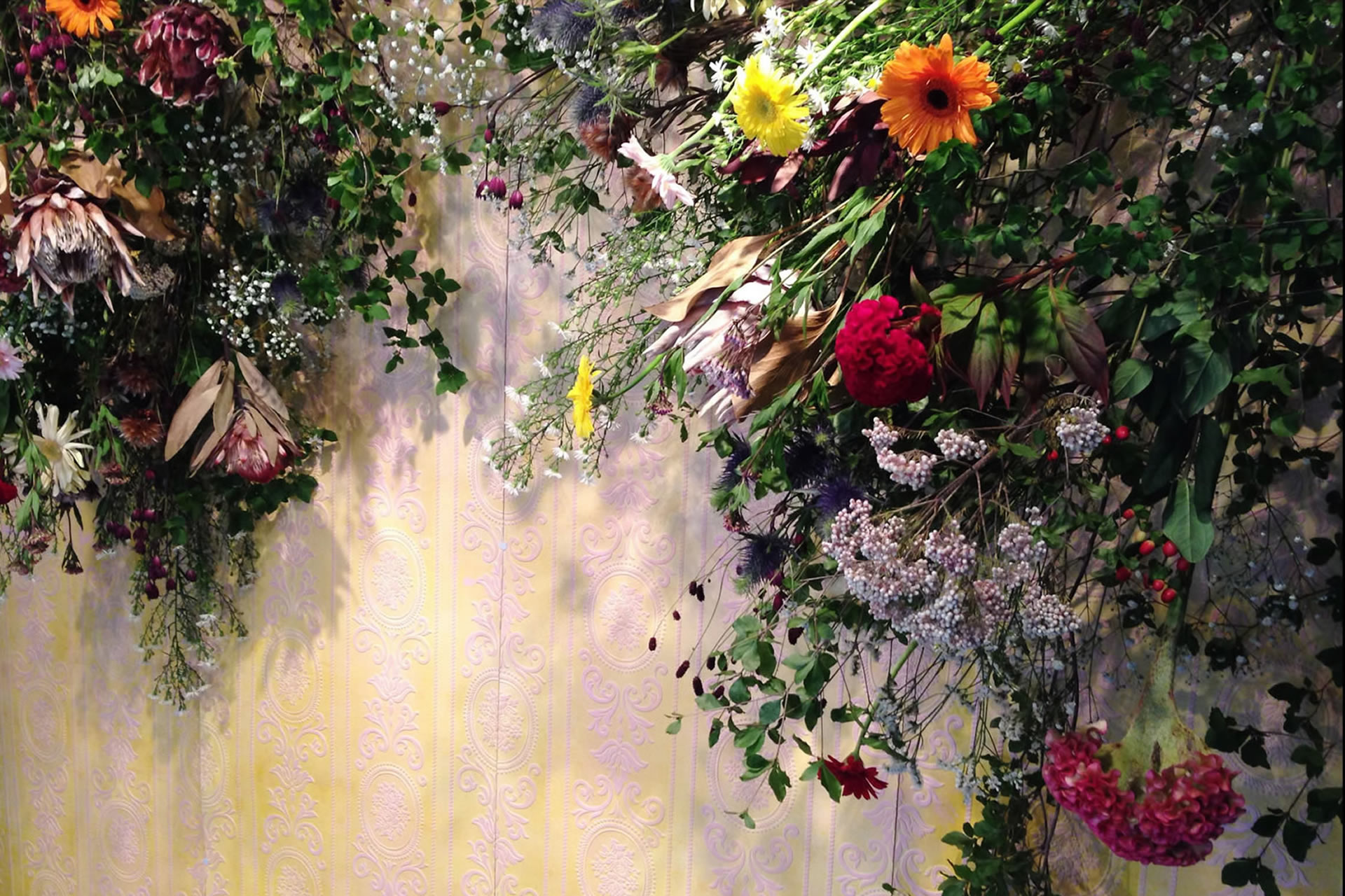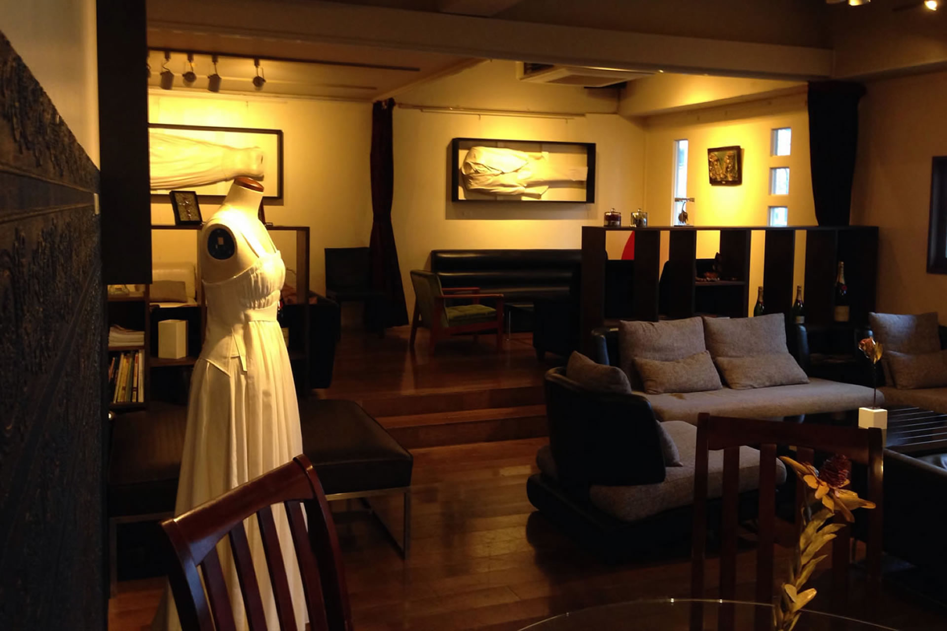contrast case (対比の事例)と題し、二つの会場にて服作りの過程と体感を提案。中目黒のカフェ「CAMARADA」では、物作りの過程の展示、製作風景を追った映像の発表、flower artの展示を行いました。池尻大橋にあるオルタナティブスペース「NANJO HOUSE」ではドレス、モーニング等をどなたでも自由にご試着いただき、服を着る喜びや楽しさを体感していただく展示を行いました。